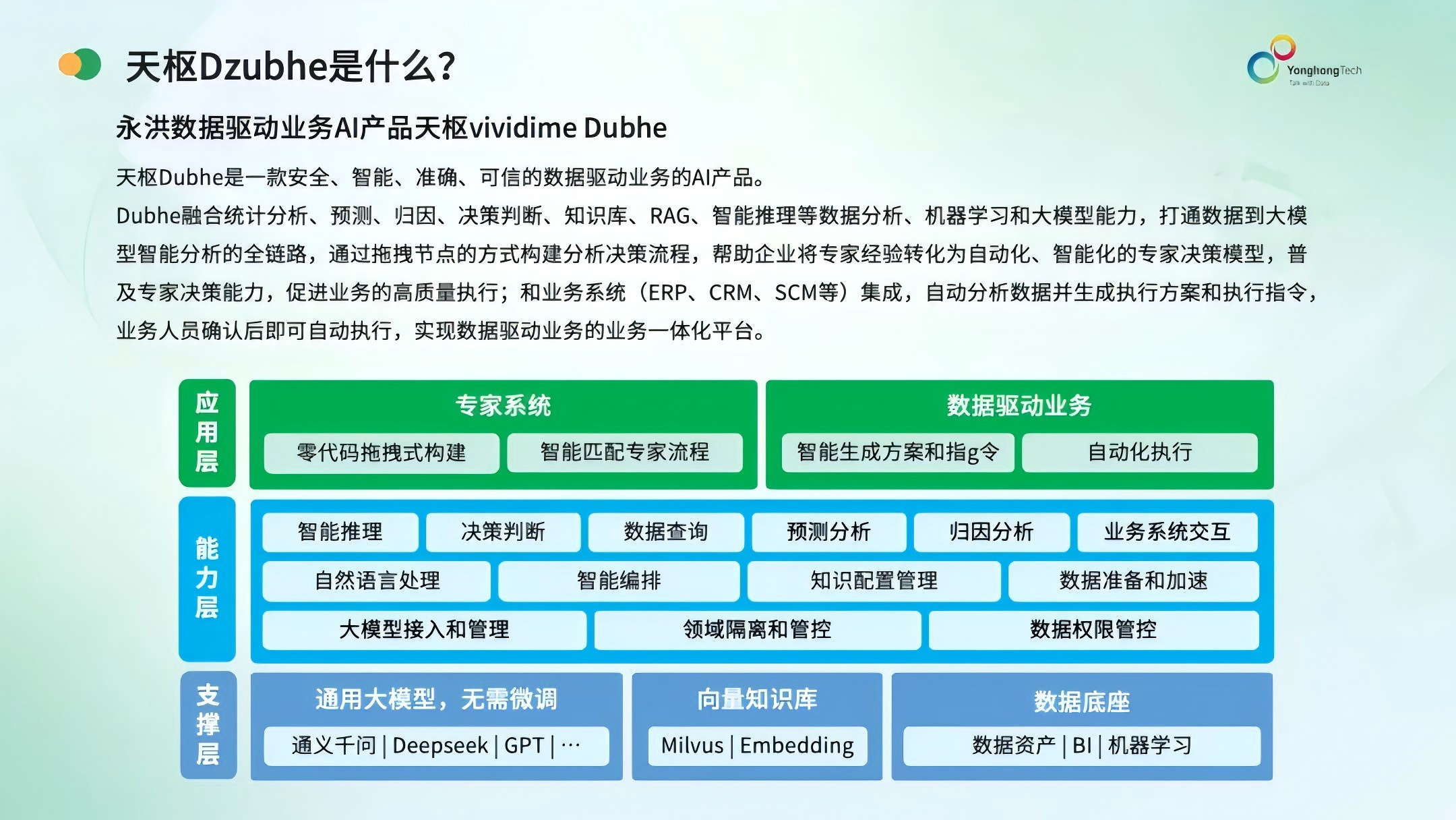 2025年7月永洪科技发布数据驱动业务的AI产品天枢Dubhe,承载了问数得方案这个联创目标的能力。