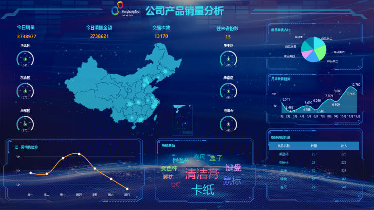 数据分析阶段,永洪 BI 的 “仪表盘” 功能将数据库中的数据转化为直观的业务洞察。用户从数据模型中拖拽字段至画布,系统自动生成柱状图、折线图等可视化图表。例如将 “地区” 字段与 “销售额” 字段组合,可快速呈现各区域的业绩表现;通过添加 “时间” 维度的筛选器,能动态查看不同时期的数据变化。更值得一提的是,图表间支持联动分析 —— 点击某一区域的柱状图,仪表盘上所有相关图表会自动聚焦该区域的数据,实现多维度的交叉验证。