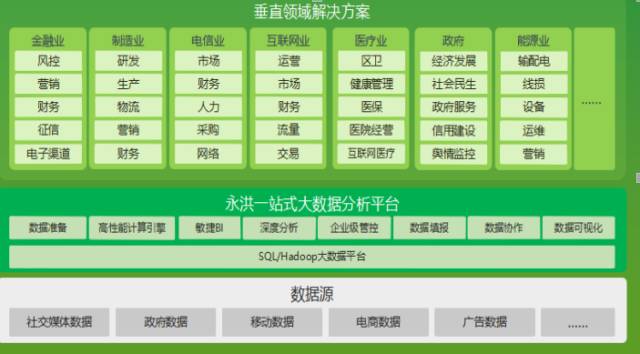 这是永洪垂直领域解决方案的体系,底层是各类数据源,包括企业和政务数据、电商数据和内部信息系统积累的数据等等。中间这部分是永洪一站式的大数据分析平台,把数据准备、敏捷BI、海量数据高性能计算引擎、深度分析、企业级管控、数据填报和可视化,全链条的一站式的大数据能力提供给客户,基于这之上可以看到很多领域的垂直应用,这些应用应该是交叉的,不同的行业不同的领域每一个交叉点都是一个场景,每一个场景都有它对应的解决方案乃至垂直的应用。