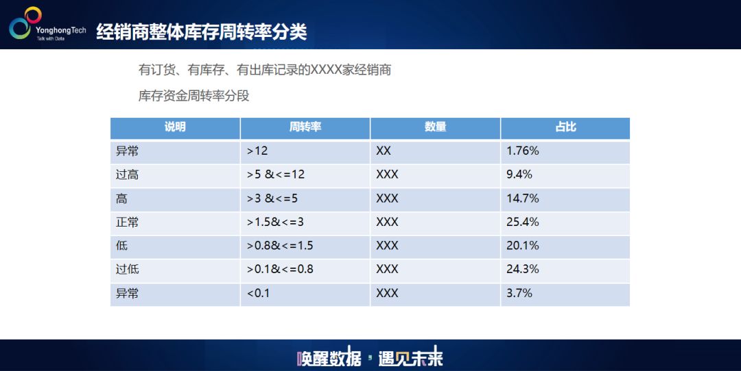 首先周转率大于12被判断为异常,可理解为库存一个月转一次,这种为异常。周转率小于0.1也被判断为异常,可理解为库存十年转一次,这也为异常。把所有经销商当成一个经销商,计算的库存率是2.39,所以认为1.5到3之间是正常的。然后对上面、下面的分别划两个等级,可以看到每一个档里面经销商的数量和占比,相对还是比较均匀的。