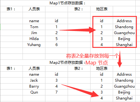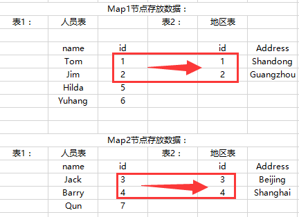 上图所示, 经过拆分存储后的数据显示表1的id1,2存放在了Map1节点;而表2的id1,2 存放在了Map2 节点上面;这个时候在join时Map节点检测到对应的数据不在同一个节点上,就会将所有的数据拿到Reduce节点重新进行全量的join。