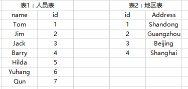 假设我们有两张表:表1人员表为大表,表2地区表为小表,如下图所示: