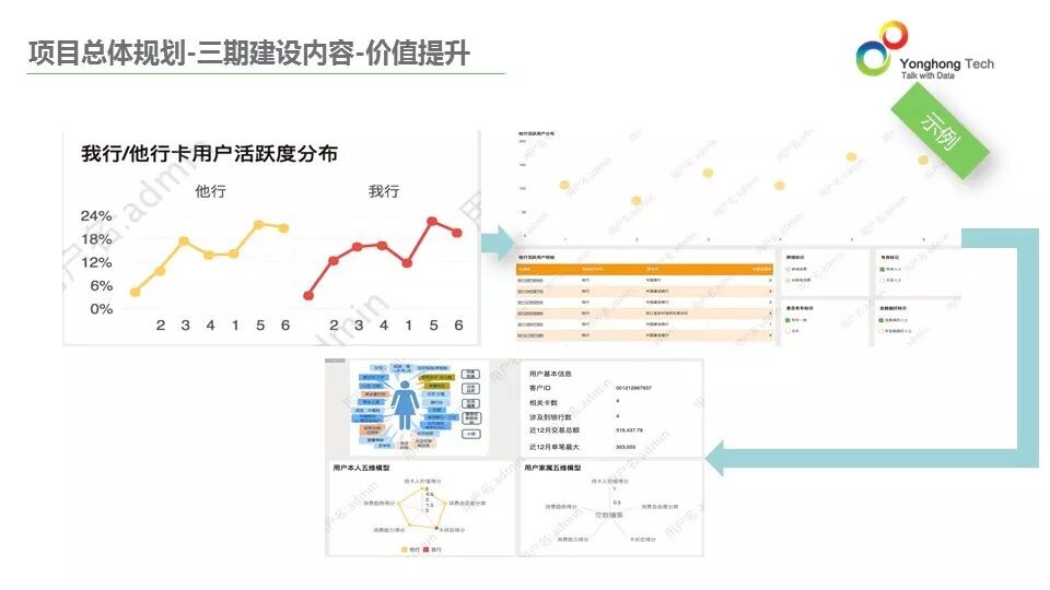 永洪科技会根据银行目前的现状进行调研和分析客户目前处于什么阶段,最迫切的需求在哪里。比如在该银行的另外几家分行,我们通过调研了解到,手工报表、数据视图、多种数据来源等没有解决,其处于第一阶段,而我们帮其解决移动管理驾驶舱、零售业务分析看板等问题。第二阶段,我们帮助其建立面向分行的数据中心,比如面向分行的大数据平台,统一数据标准、统一主数据管理及ETL等;第三阶段,我们帮助该分行做闭环营销管理、场景式营销等更有挑战的数据应用。