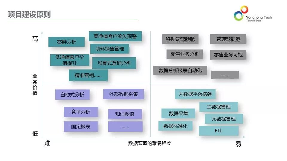 想要完成数据驱动业务变革不是一蹴而就的事情。不同银行所处的信息化建设程度不同,而进行数据驱动需要考虑数据获取的难以程度和应用能解决的业务价值。就拿我们的一家客户,某大型股份制银行的某分行来说,现在所处数据获取难业务价值难的象限中,其在2015年开始使用永洪大数据分析平台,面向分行业务人员的固定报表、零售业务分析、管理驾驶舱已经完成,且建设面向分行层面的数据中心。现在在做客群分析、低净值客户价值提升、场景式分析等分析。该银行的多家分行都处于第一阶段,管理驾驶舱、报表自动化还没解决,分行业务人员还在花大量的时间做手工报表,意味着仅看到报表结果,没有数据洞察且浪费很多时间在做数据报表。