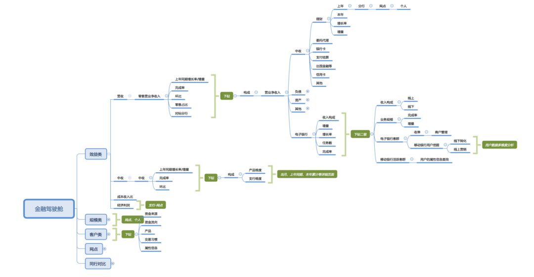 说明:网点对银行来说是成本的一个中心,对网点的选址、人和网点之间的匹配,很多年轻用户不太去网点等情况使网点面临很大的挑战。在这种情况下,对网点进行网点业务类型、网点产能、网点效能、网点成本收益比、网点人员、网点运营等方面进行细分,对银行网点进行分析。