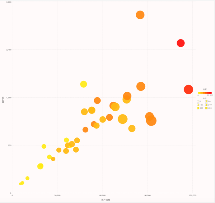 如上图所示,通过散点图,可以一目了然的知道资产、客户数、储蓄、中收核心指标。对于客户数多资产相对少,对于资产和储蓄相对多客户数相对少的即大客户较多,不同类型网点如何做资产管理,人员配置等;针对客户数资产和储蓄、中收都很少的客户我们需要思考如何做网点的优化和转型。进一步细分,精细化网点管理,一网点一政策,一网点一考核,做精细化管理和考核的视图。