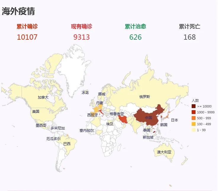 截止北京时间3月2日,全球除中国以外共68个国家和地区新冠肺炎疫情累计确诊病例10107例,现存确诊9313例,累计死亡168例,累计治愈626例,死亡率为1.66%。