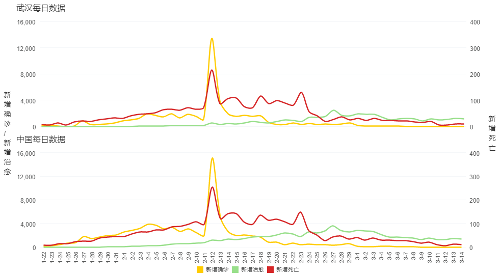 我们先看看武汉地区和全中国的每日新增病例趋势,这里为了方便看到每日新增病例的变化情况,我们选择线图来展示数据变化情况,利用线图连续性的特点,将病情数据和日期节点做关联,将新增确诊、治愈、死亡人数展示在同一个坐标系统,通过线条的走势看到数据变化情况。