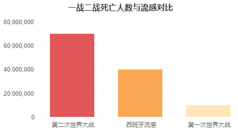西班牙流感在约6个月内夺去2千5百万到4千万人的生命,比持续了52个月的第一次世界大战死亡人数还多。此外此流感也是第一次世界大战提早结束的原因之一,因为各国都已没有额外的兵力作战。我们可以使用柱状图来对比两次世界大战造成的死亡人数和西班牙流感造成的死亡人数的比例关系,