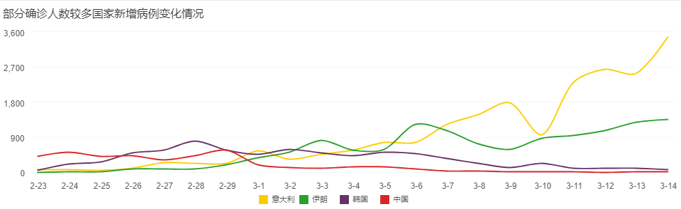 由于目前中国所经历的疫情阶段最长,通过观察可以看出新增数据的发展经历了增长期、平台期和下降期,在隔离措施实施20天后,每日新增达到了最大值,之后经过了15天左右的波动,新增数量开始下降,整体疫情在持续了两个月之后,3月7号全国新增确诊控制在了两位数。