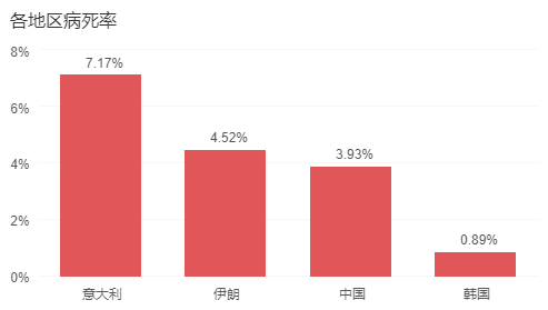 我们再次使用柱图来展示到目前为止各个国家已统计数据中的新冠病毒病死率情况,通过柱图方便对比的特点,可以看出各个地区病死率比较的结果。