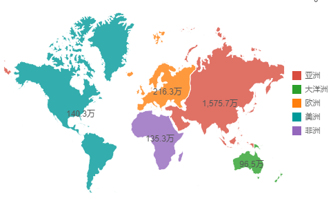 为了直观的看到西班牙流感在全世界带来的损失,我们可以使用Map组件,直接把各大洲的死亡人数数据展示在世界地图上,可以看到每个洲的病情情况。