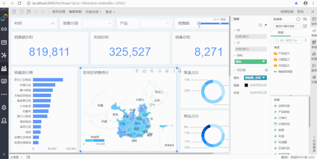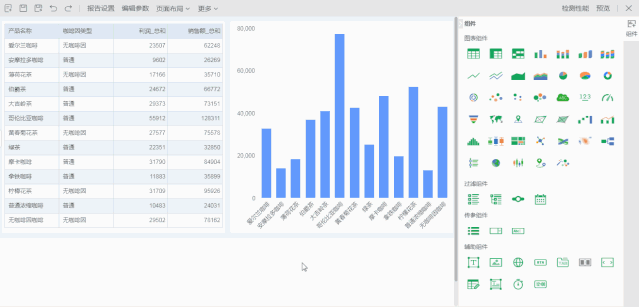 新版本将数据区域与组件设置区域统一放在页面右侧,提供了更宽敞的编辑区域,让用户制作报告的过程更加方便。其中包括:增大编辑页面区域、优化数据tab页的交互及数据tree的使用、调整组件tab内容、优化切换图表的入口、行列转换入口更明显等。如下图所示。