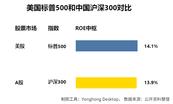 这些持续上涨的股价背后是来自于企业盈利的增长。衡量公司的盈利能力,股神巴菲特最看重的是企业的净资产收益率ROE,以美国标普500和中国沪深300来做一个对比: