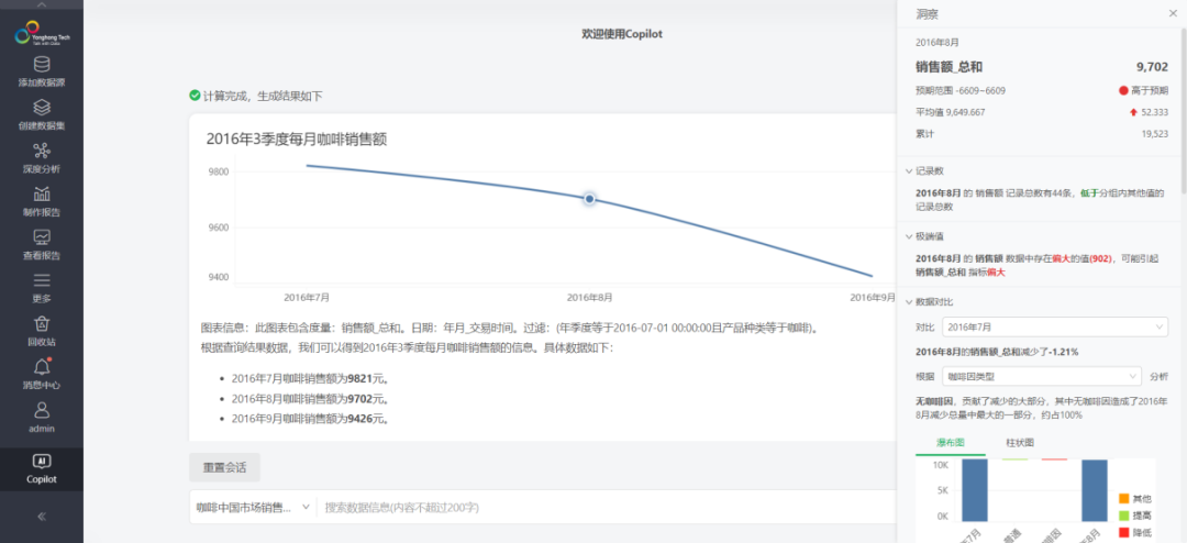 同时支持对问答结果进行数据深度洞察,全方面对数据进行分析,并探索数据增长/降低的策略。