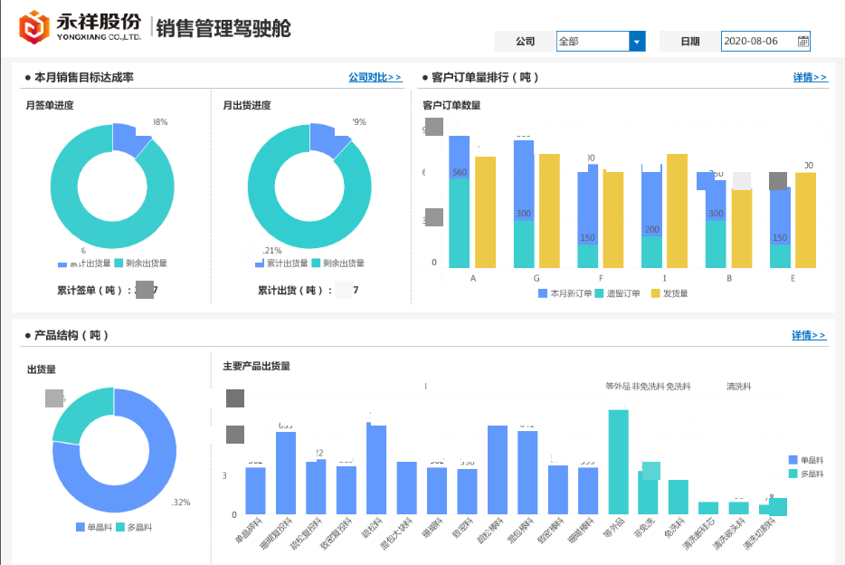 销售管理模块包括1张仪表盘、3张分析报表、2张填报表。销售管理模块从订单管理、进度管理、销售额分析、销售结构分析、客户价值分析、销售费用分析、区域销售管理、产销匹配多个分析角度出发,对永祥硅料公司销售情况提供多维度分析窗口。同时进行销售精益管理日报表的推送,加强股份内部硅料产品的销售管控和数据分析。
