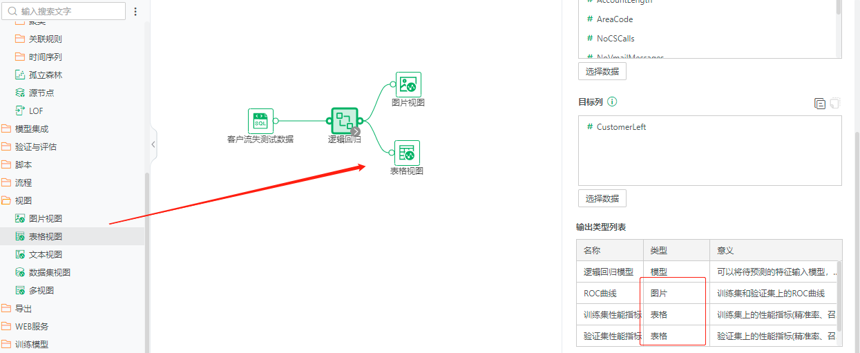 在逻辑回归配置项目的输出类型列表中可以看到,输出结果有表格和图片。从操作资源树的视图文件夹中选择表格视图和图片视图或多视图,拖入到画布中,与逻辑回归节点相连。