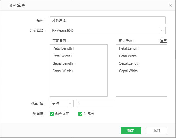 【聚类维度】聚类的样本集。从左侧的可配置列中选择需要作为聚类维度的字段直接拖入到聚类维度框中。
