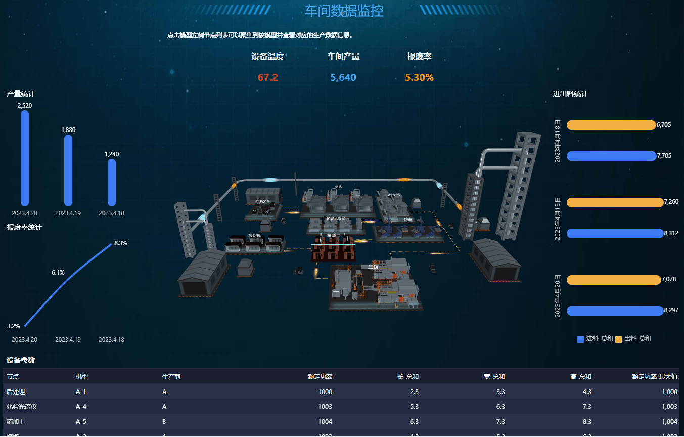 4)在报告内添加其它分析图表组件,并绑定生产数据,数据需要包含模型名称或节点,以便和3D模型完成联动。