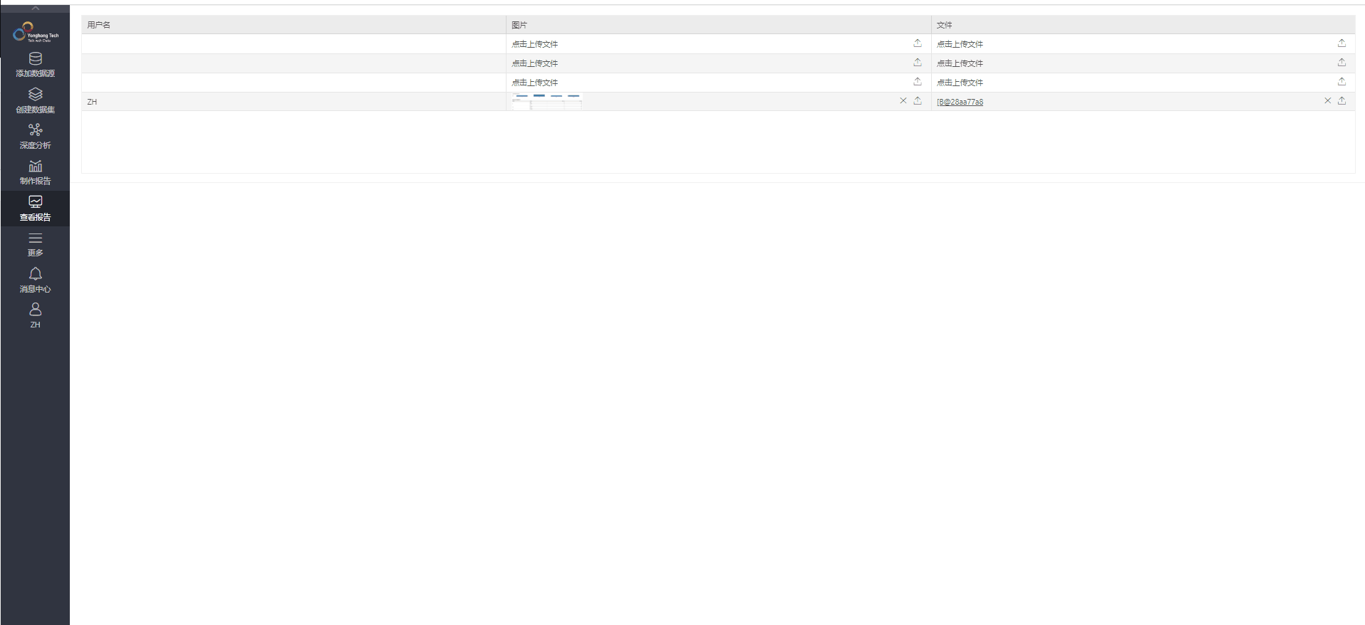 销售经理ZH登录产品,打开个各区域销售的数据分析填报报告,分别选中图片列、文档列,上传所在区域的销售数据分析图片报告、文档报告,用户名列会根据登录用户自动填写,并且不可修改。填写完成后,点击提交按钮,页面提示提交成功,刷新报告。