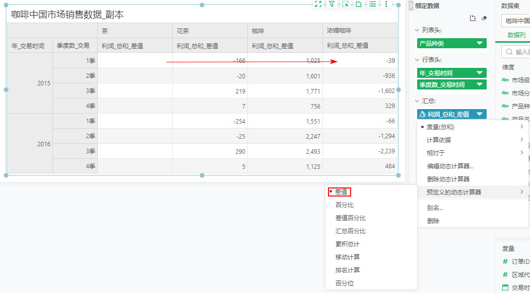 1)利润_总和下拉菜单中选择【预定义的动态计算器 > 差值】,计算依据默认为“表格横向”,相对于默认为“向前”。