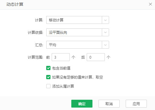 移动计算,即依据当前值的位置,取向前或向后n个值计算汇总值,前后方向由计算依据决定。通常用来统计分析汇总值在一段时间内的变化趋势。