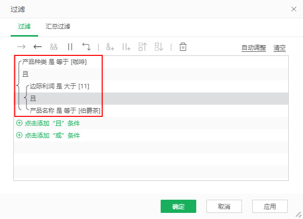 【自动调整】如果过滤条件设置中线为红色,点击“自动调整”,自动调整不合法的过滤项,并合并可以合并的过滤项。标红的原因可能是同一层级上的多个过滤条件,同时出现了“且”、“或”条件关系,用户还可以手动调整条件层次、条件关系。自动调整时,“且”优先。