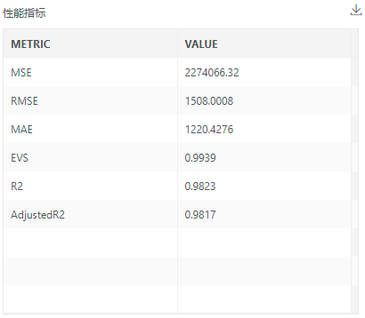 1.模型性能指标:训练集上的性能指标:MSE、RMSE、MAE、EVS、R2、Adjusted R2。其中MSE、RMSE、MAE是各种计算方式下的预测损失值,值越小越好;EVS是方差得分,值越接近1越好;R2和Adjusted R2都是评价不同量级下模型效果好坏的指标,值越接近1越好。