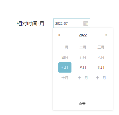当前日期为2022-07-14,默认值为常规-本月,最小值为内置参数?{_NOW_}-2022-七月,最大值为最小值的后2月,2022-七月和八月。 用户可在最小值与最大值范围以内选择其它月,范围以外的月灰化不可选择。