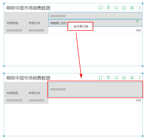 表、交叉表组件进入元数据模式后,选中多个单元格右键可以进行“合并单元格”。
