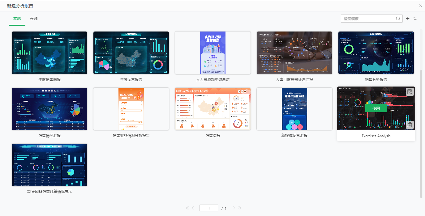 4)上传成功后,模板文件在“本地”可见,您可以选择模板模板右上角的“预览”按钮,也可以直接单击模板中央的“使用”按钮,创建一份和模板一样的报告。