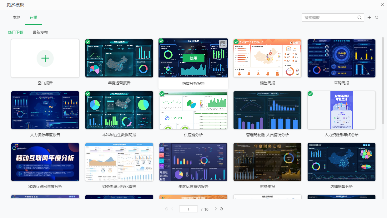 3)在新建分析报告页面,默认选择模板“在线”选项卡,可以选择本地、在线的模板创建新的报告。如果选择本地模板,你可以直接点击右下角的“使用”按钮新建报告;如果选择在线模板,你需要点击右下角的“下载”按钮,先将模板下载至本地后使用。