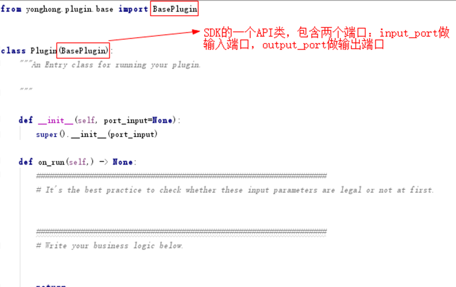 SDK的API用于插件main.py文件。插件入口类Plugin继承自BasePlugin类,该类含有一个on_run()回调方法在插件运行时调用。同时,BasePlugin类还包含input_port与output_port两个端口变量:
