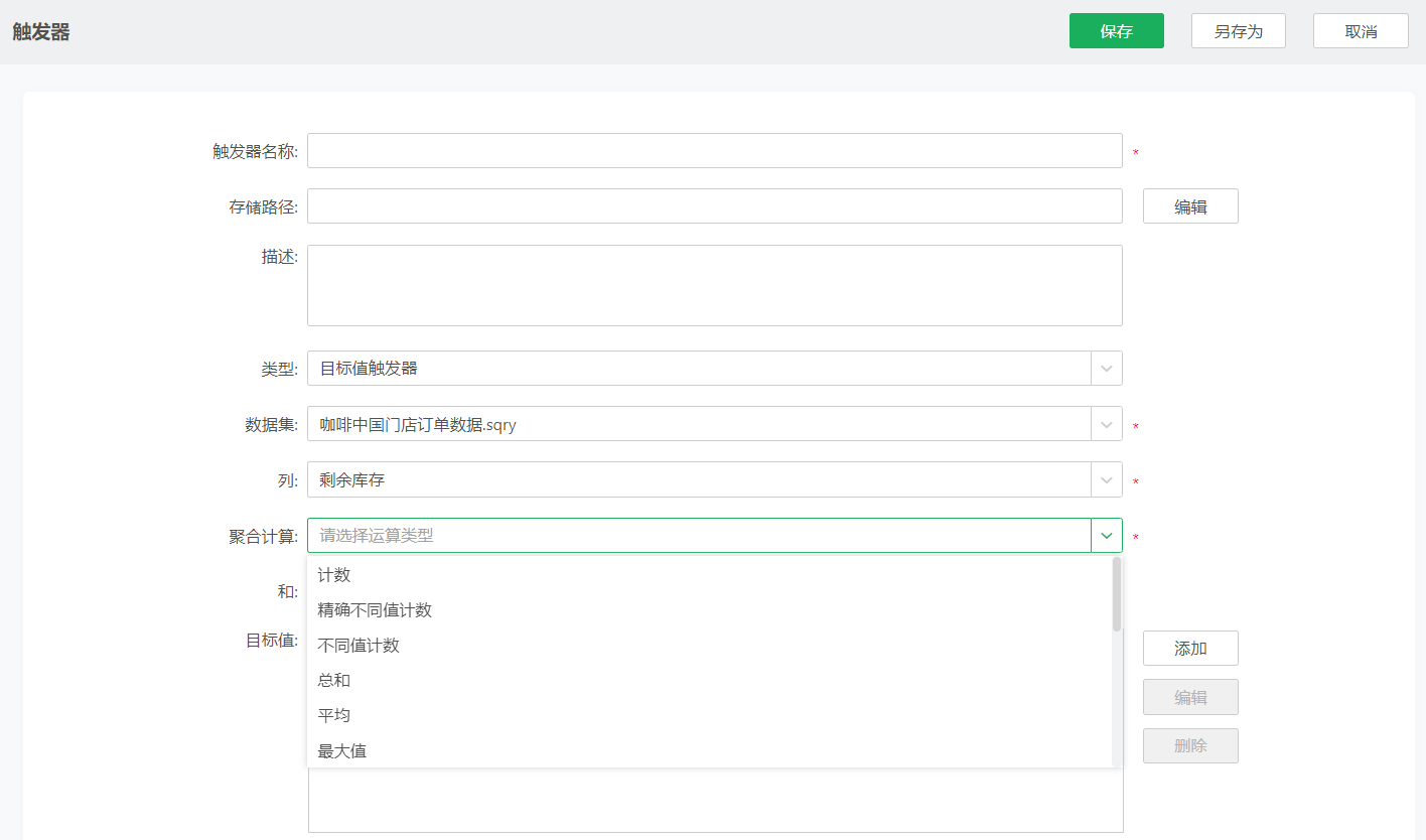 目标值触发器是指通过设定数据集中某些指标的聚合计算方式(如最大值、最小值)来作为触发条件。
