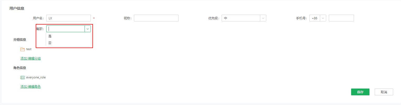用户除了用户名、昵称、邮箱等默认属性配置外,admin_role角色的用户可支持自定义属性配置,比如职位、地区等。自定义属性配置项为全局配置,配置生效后对系统内全部用户生效。