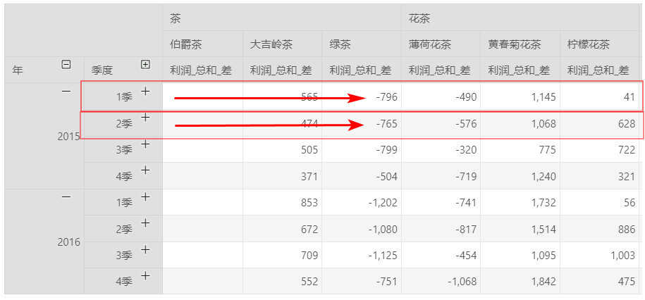 此时会以季度为依据,分别计算每年的不同产品利润_总和差值,结果如下图: