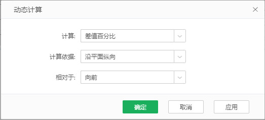 【计算】选择一种计算函数,包括差值、百分比、差值百分比、汇总百分比、累积总计、移动计算、排名计算、百分位、定制,选择差值百分比。