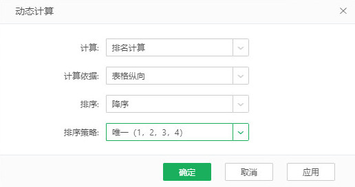 【排序策略】选择一种排序策略,包括竞争排序(1,2,2,4)、调整后竞争排序(1,3,3,4)、密集(1,2,2,3)、唯一(1,2,3,4),数据中不包括相同值,选择任一一种即可,这里选择唯一。如果数据值中包括相同值,选择不同的排序策略,位次也不同,详细介绍请参考 2.3排序策略