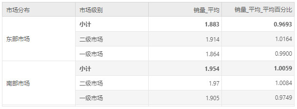 之前的版本,平均值汇总百分比=当前平均值/组内平均值的均值,以计算同一市场分布下不同市场级别的销量平均值汇总百分比为例: