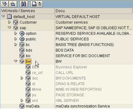 使用TCODE: SICF来确认, 依次展开【default_host > sap > bw】