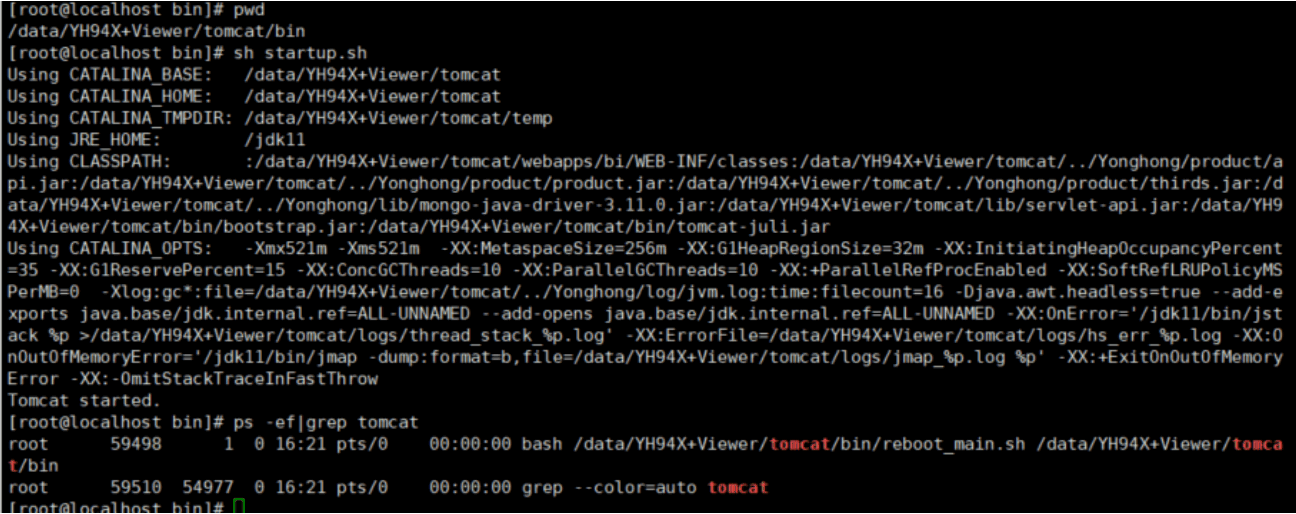 •Linux环境,到tomcat/bin目录下,执行sh startup.sh启动永洪,启动后查不到进程。