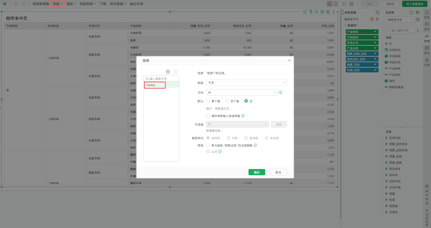 10)在对应的目标超链接报告中,顶部栏【参数>编辑参数】新建参数market,具体内容如下图