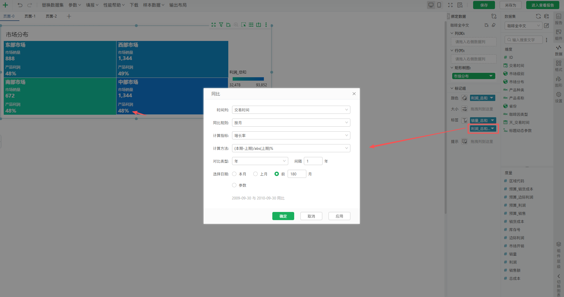 5)点击【标记组 > 标签】栏中“利润_总和”下拉菜单“同比”,对其设置同比增长率,如下图