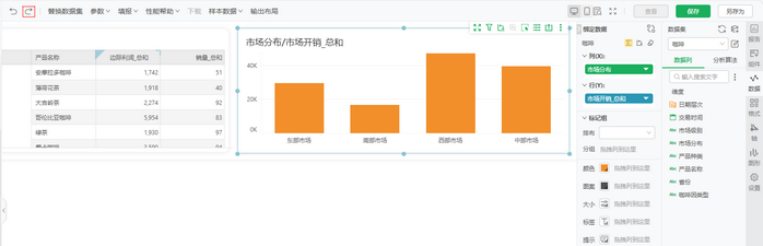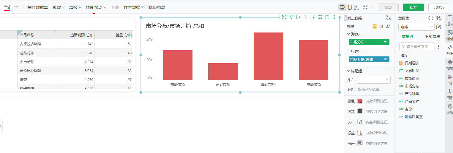 查看报告时,若需查看柱图中的南部市场标记笔刷联动表格中的南部市场数据时,可按下Ctrl+Y(Windows)/Command+Shift+Z(macOS)或点击报告顶部工具栏上撤销按钮重做按钮撤销为联动数据分析结果。