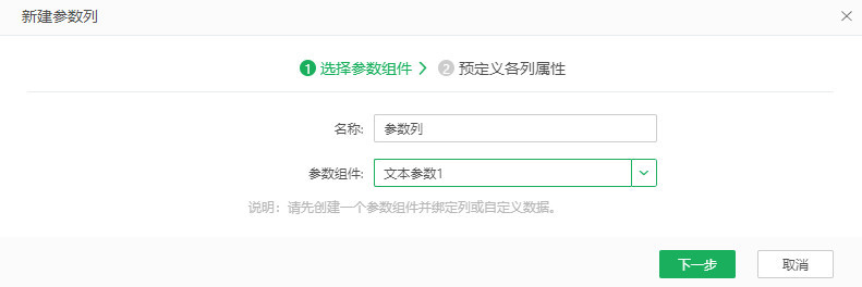 a)在“新建参数组件”的对话框中,第一步选择参数组件,包括定义参数列名称,选择参数组件中创建的“文本参数1”。