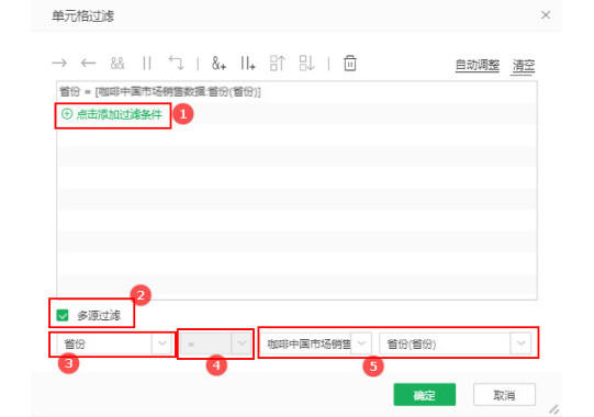 3)选中“利润”所在单元格,点击【单元格过滤】,勾选【多源过滤】,设置过滤条件:省份=[咖啡中国市场销售数据:省份(省份)]。