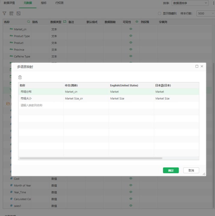 在数据库中为每种语言分别存储对应字段值,例如为英文和中文分别设置 Market 和 Market_zh字段。通过数据集或报告上建立多语言映射列,根据选择的语言动态读取相应字段,从而实现不同语言下的字段切换。