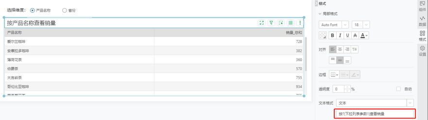 图表、文本等可以绑定数据的组件中,也可以使用{0}引用当前数据。
