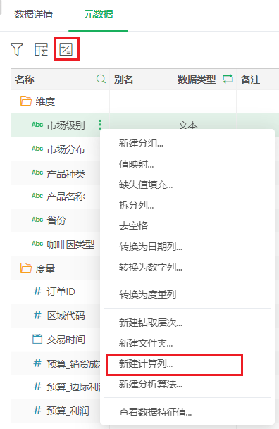 用户也可以通过点击新建计算列icon,实现相同的创建计算列操作。