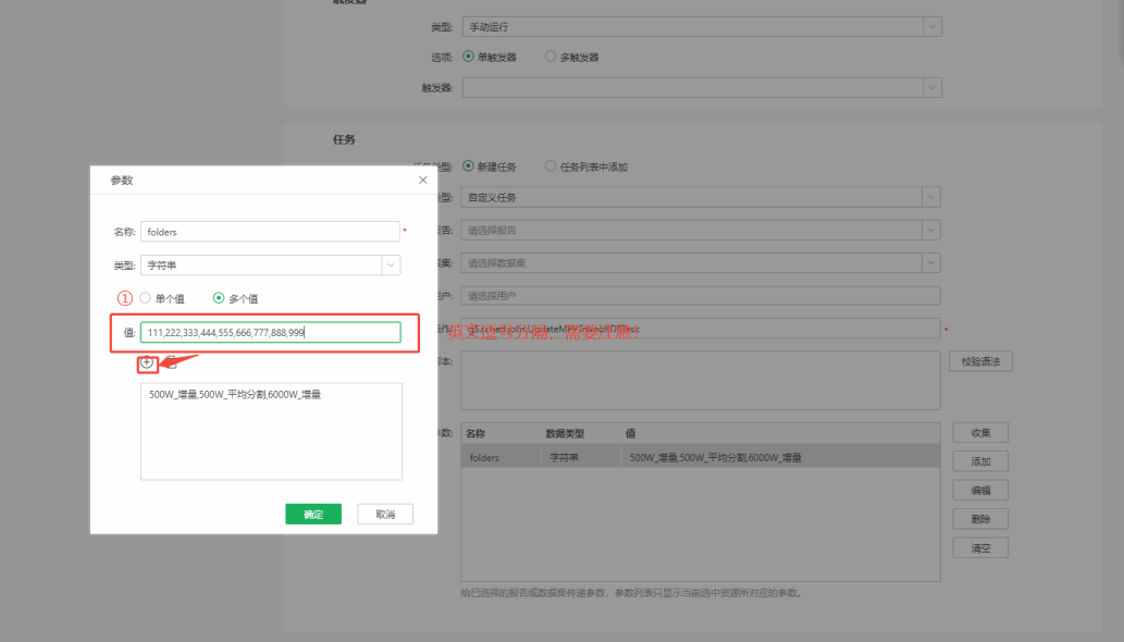 6)点击“编辑”参数,默认多个值,输入框输入集市folders,以英文逗号隔开,点击加号,保存。